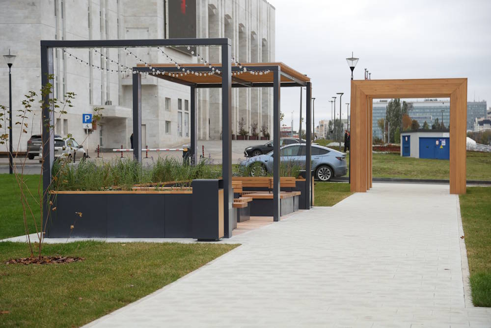 В начале осени в сквере, расположенном в 64-м квартале эспланады, завершились ремонтные работы. Команда специалистов обновила пешеходные зоны, создав комфортные дорожки, заменила асфальтобетонное и плиточное покрытие, а также провела модернизацию системы освещения. В рамках озеленения был восстановлен газон, высажены новые деревья и кустарники. Кроме того, в сквере установили сцену и современные малые архитектурные формы, в том числе парклеты – зоны отдыха, оборудованные столами, скамейками и навесами с декоративным освещением.