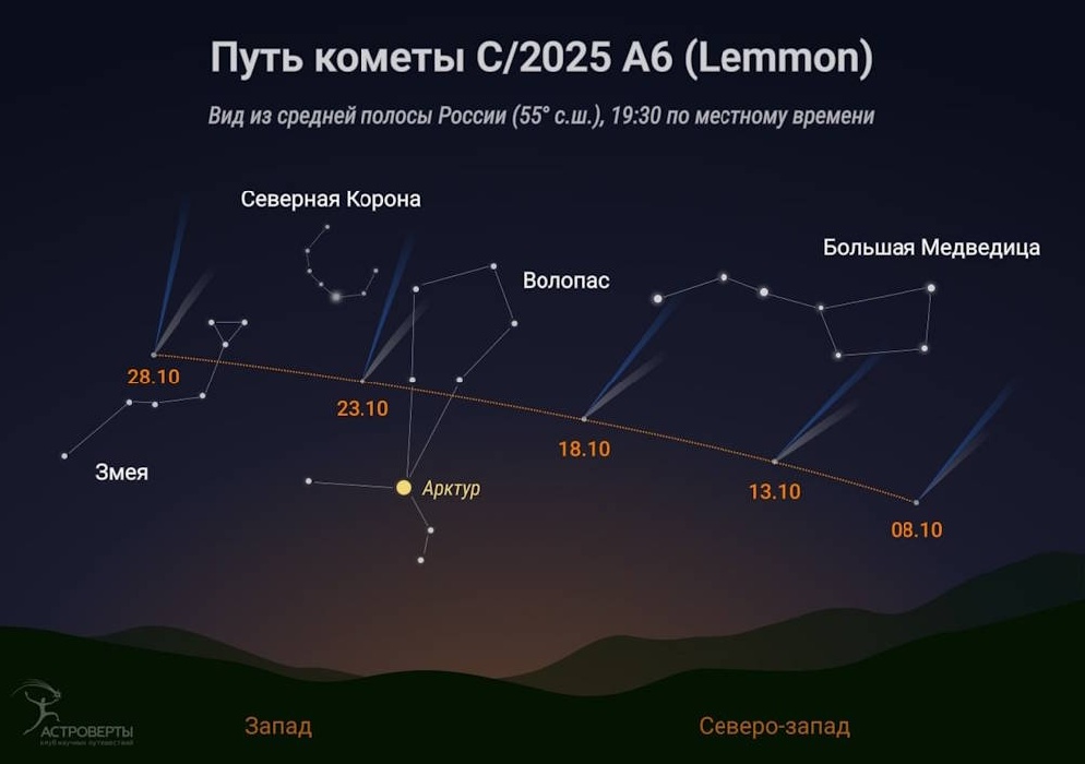 В Пермском крае начался вечерний сезон видимости самой яркой кометы этого месяца - C/2025 A6 (Lemmon). С 10 октября условия видимости кометы станут лучше в вечернее время, чем в утреннее, т.к. Луна начнет постепенно переходить на утреннее небо. С каждым вечером безлунное темное время будет постепенно увеличиваться, и комета будет всё выше подниматься над северо-западной частью горизонта. Искать ее нужно под Ковшом Б.Медведицы.