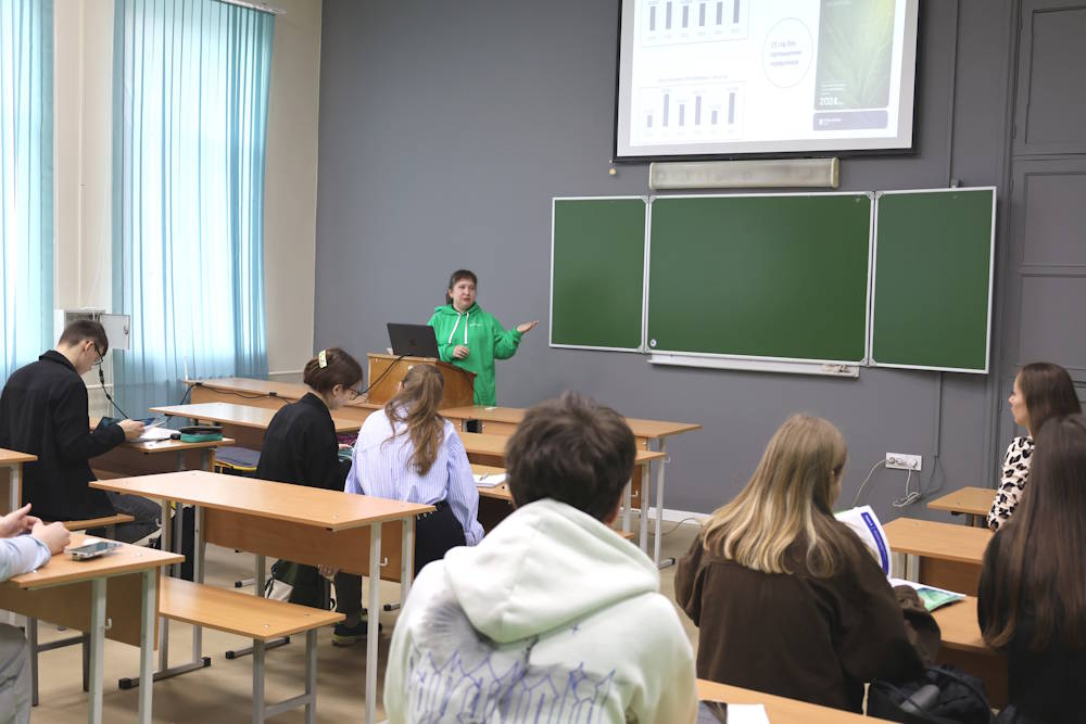 Студенты направления «Экология и природопользование» узнали от сотрудницы о практических мерах охраны окружающей среды на производстве «ПМУ». Елена Шамиева подробно рассказала о системе производственного экологического контроля, раскрыв ключевые аспекты работы: постоянный мониторинг атмосферного воздуха, грамотное обращение с отходами, строгий контроль качества подземных и сточных вод.